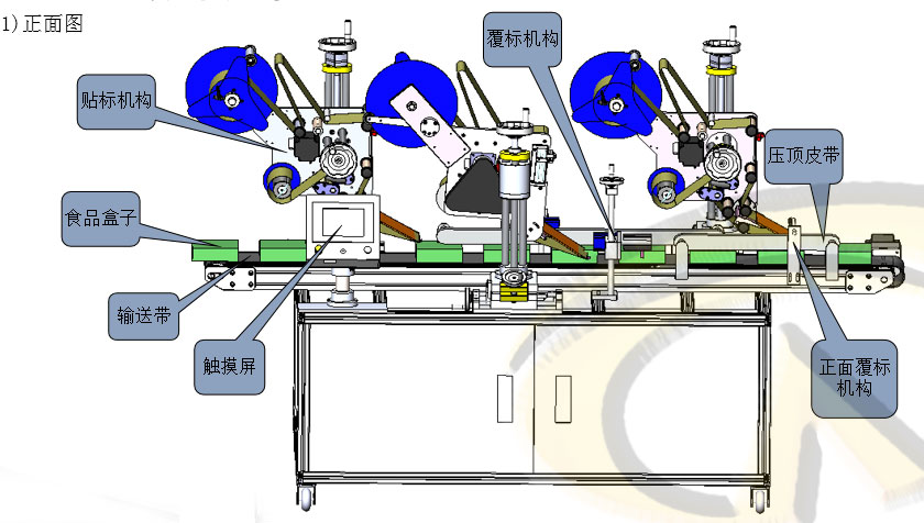 人工把食品(pǐn)盒子放到貼標機輸送帶上即可,機器自動完成食品盒子的輸送,導正,定位,貼標,覆標動作,人工再把成品取下。
