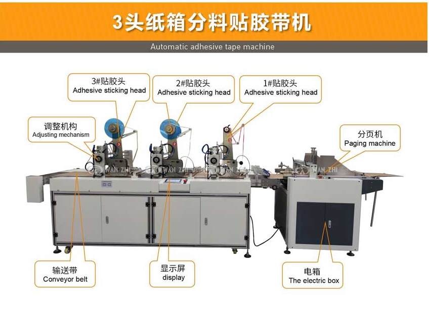 本機型可配置2個或3個貼膠頭,實現輸送方向(xiàng)同時貼多條膠帶,貼合長度(dù)可任意設定; 貼膠頭可根據用戶需(xū)求選配;