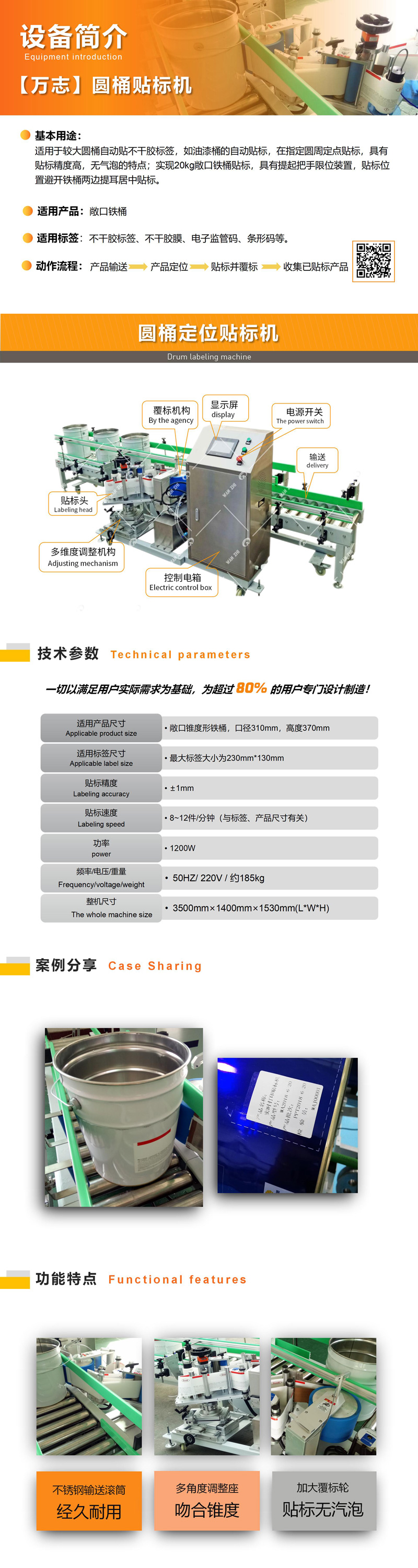 全(quán)自動油漆桶貼標機適用於油漆(qī)桶的自動貼標,圓周定點(diǎn)貼標,具有貼標(biāo)精度高,無氣泡的(de)特點;實現20kg敞口鐵桶貼標,可實現(xiàn)定位貼標,具有提起把手限位裝置(zhì),貼標位置避開鐵桶兩邊提耳居中(zhōng)貼標。