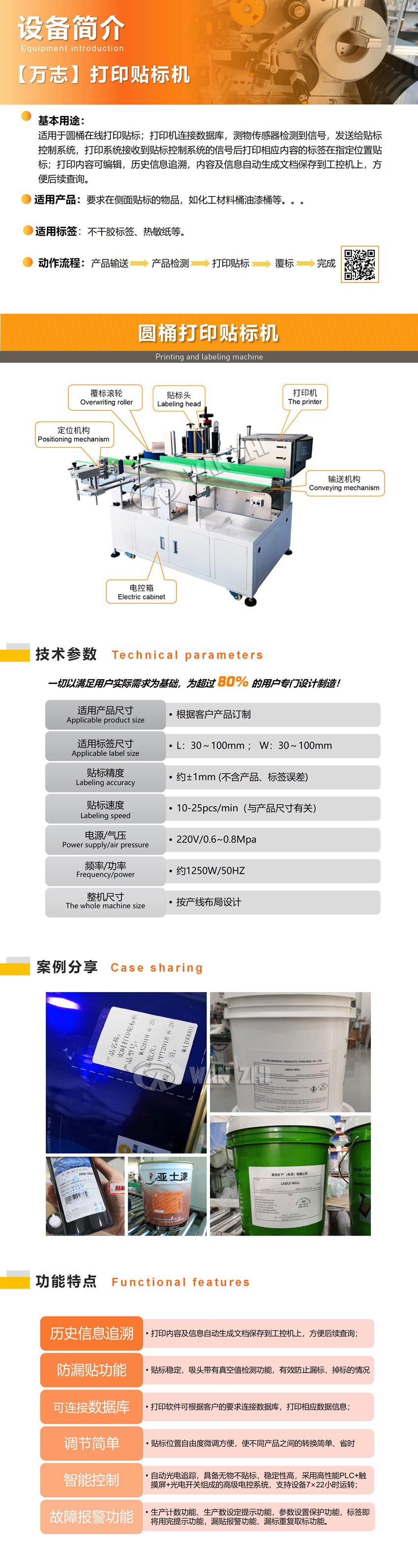 在線(xiàn)打印圓桶(tǒng)定位貼標機適用於圓桶形產品即時(shí)打印貼標。自動檢測產品(pǐn)定位貼標;廣泛應用(yòng)於油漆桶定位貼標(biāo)。