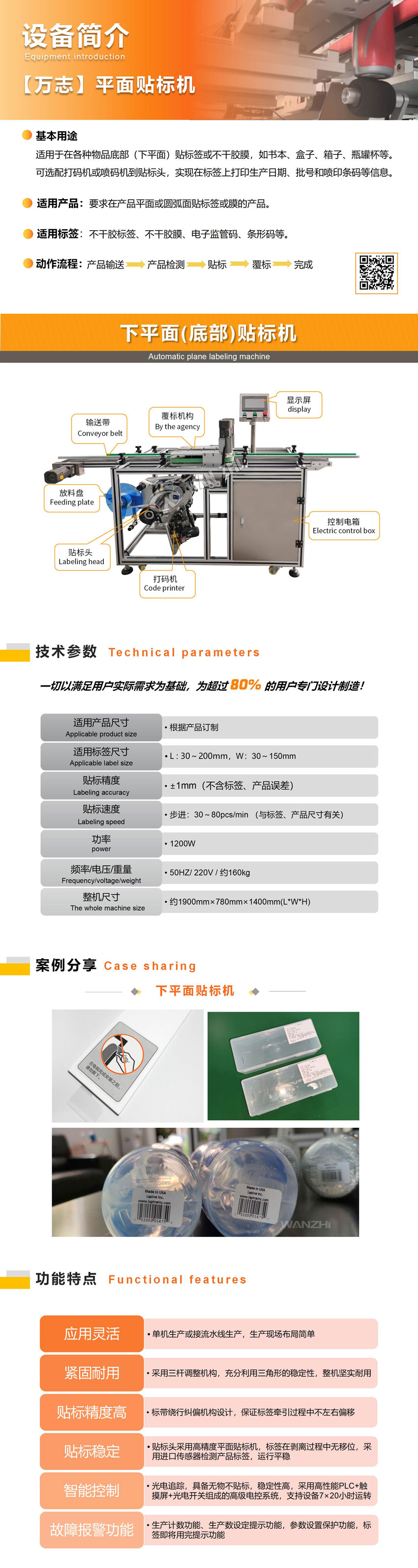 基本用途 全自動下平麵貼標機適用於在各種物品的底部(下平麵)貼標簽或不幹膠(jiāo)膜,如書本、盒子、箱子、圓罐貼標等,廣泛(fàn)應用於產品的底部(bù)貼。可選配打碼機或噴碼機到貼標頭,實現在標簽上打(dǎ)印生產日期(qī)、批號和噴印條碼等(děng)信息(xī)。