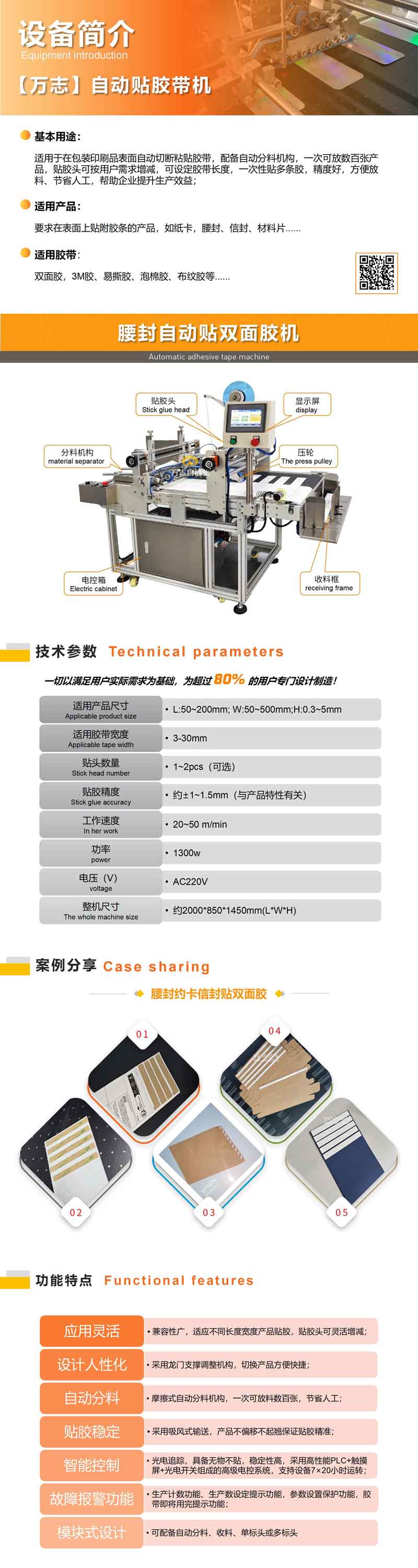 適用於在包裝印刷品表麵自動切斷粘貼膠帶,配置備自動分料機構,一次可放數百張產品,貼膠頭可按用戶需求增減,可設定膠(jiāo)帶長(zhǎng)度,一次性貼多條膠,精度(dù)好,方(fāng)便放料、節省人工(gōng),幫(bāng)助企業提升生產 益;