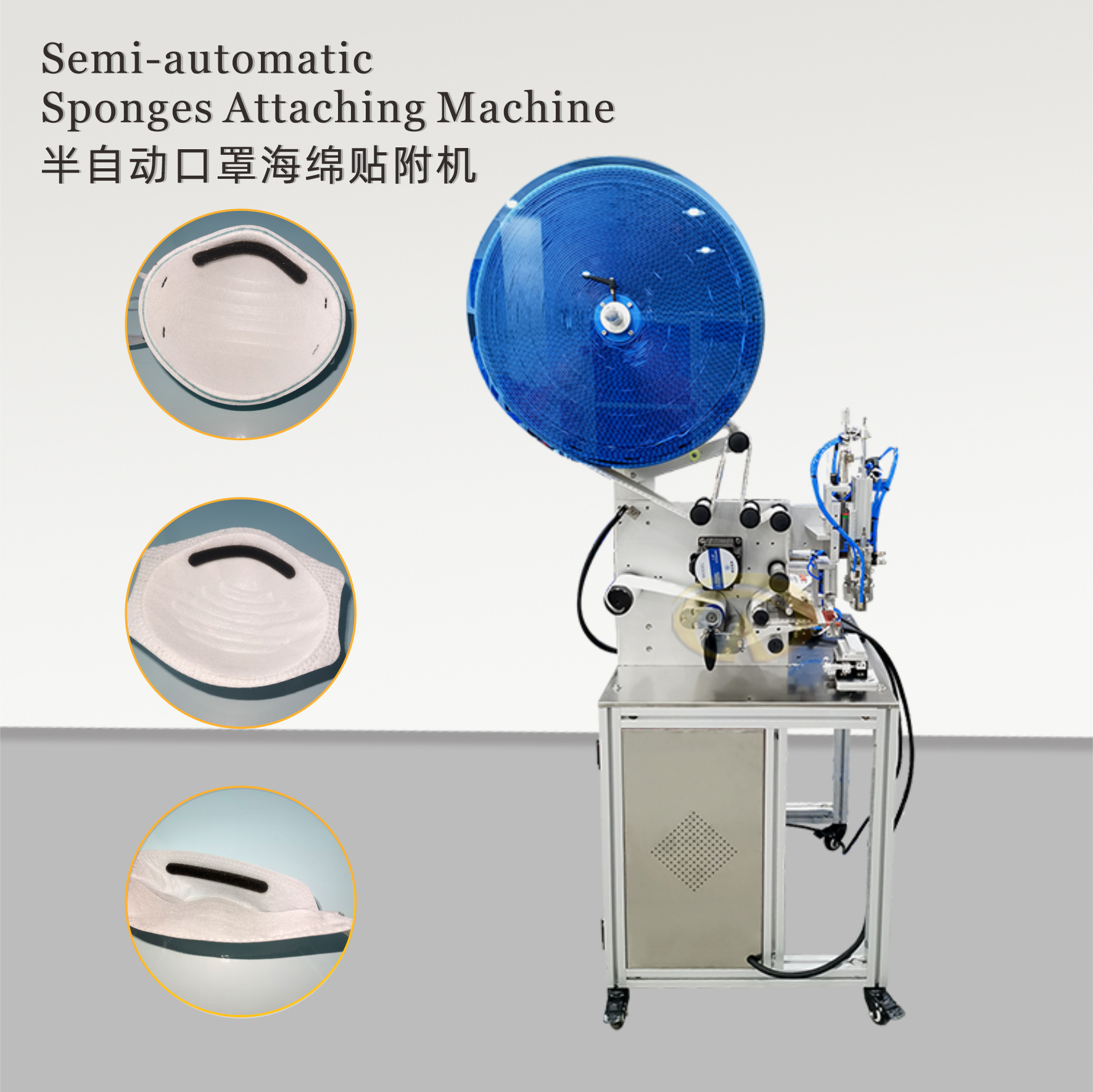 專(zhuān)用於口罩(zhào)鼻梁(liáng)處貼海綿(mián)條,配置高精度吸標頭,采用草莓视频在线观看18新研發的取標機構,能有效解決人工貼條引起的變形、誤差等問題;更換產品治具,可應(yīng)用於各種形狀口罩貼海綿條(tiáo)。